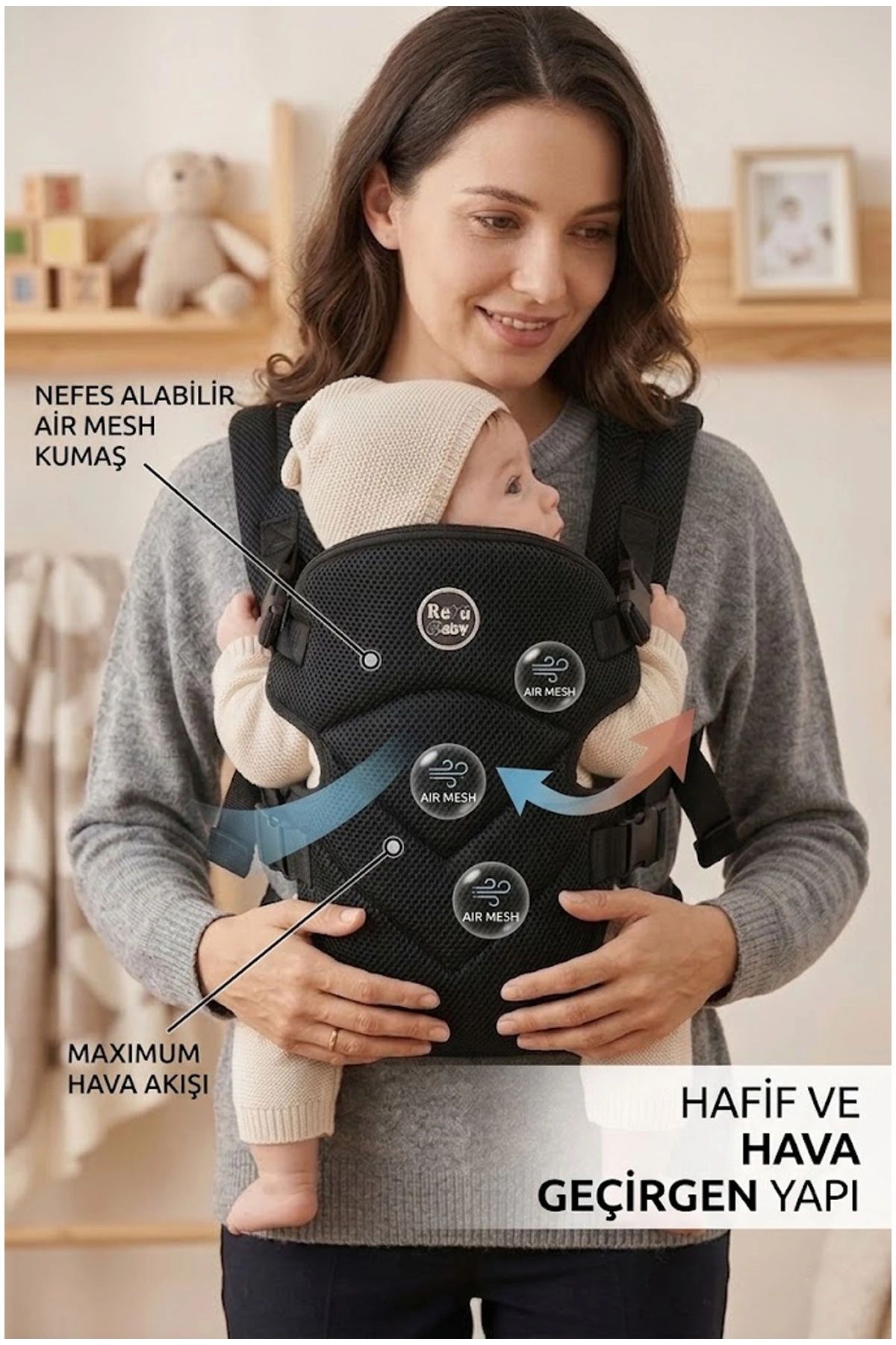 - Hava akışını artıran özel Air Mesh kumaşı sayesinde bebeğinizin rahat etmesini sağlar.